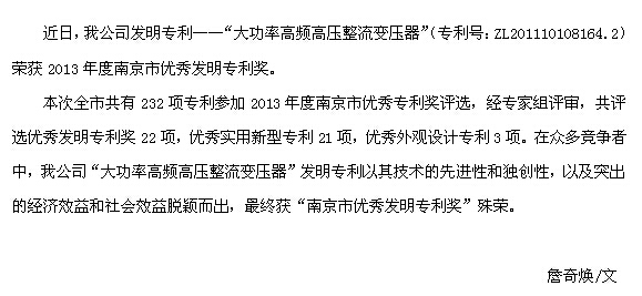 公司一項(xiàng)專利榮獲市優(yōu)秀發(fā)明專利獎