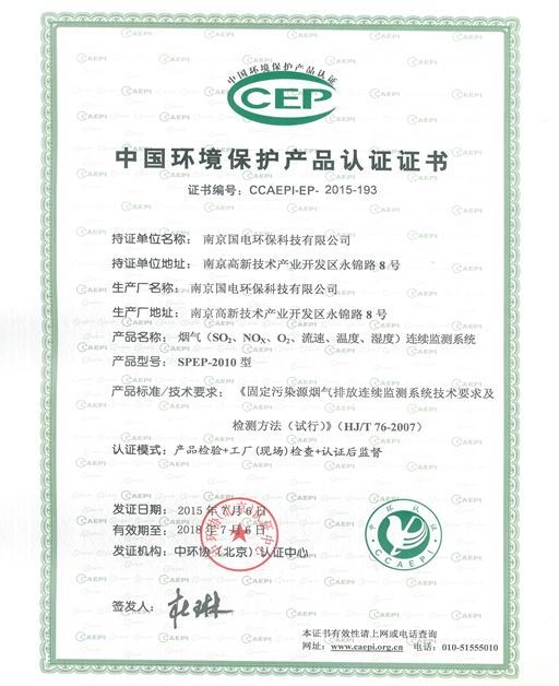 近日,由我公司自行研制的“SPEP-2010型煙氣排放連續(xù)監(jiān)測(cè)系統(tǒng)”經(jīng)中環(huán)協(xié)(北京)認(rèn)證中心認(rèn)證、批準(zhǔn),獲得了中國(guó)環(huán)境保護(hù)產(chǎn)品認(rèn)證證書(shū),證書(shū)編號(hào)CCAEPI-EP-2015-193,有效期3年。