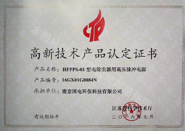 2016年7月,我公司自主研發(fā)的HFPPS-01型電除塵器用高壓脈沖電源通過(guò)江蘇省科學(xué)技術(shù)廳認(rèn)定,并頒發(fā)高新技術(shù)產(chǎn)品認(rèn)定證書。