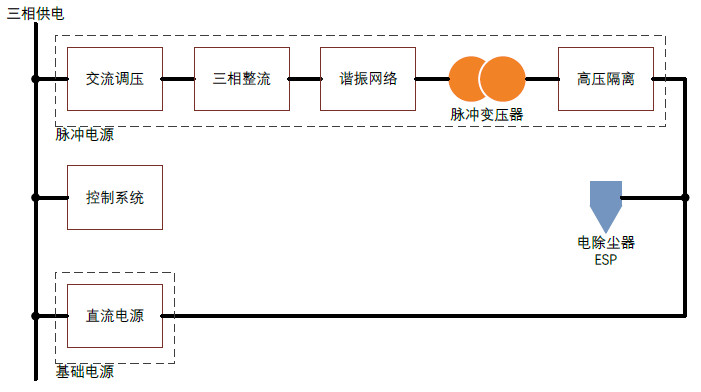 脈沖電源采用間歇供電方式,其供電時間短且采用能量回饋機(jī)制。脈沖源負(fù)責(zé)粉塵荷電,而基礎(chǔ)電源只需維持電除塵器電場起暈電壓,提高了電能利用效率,在滿足除塵效率的同時減少了供電功率。