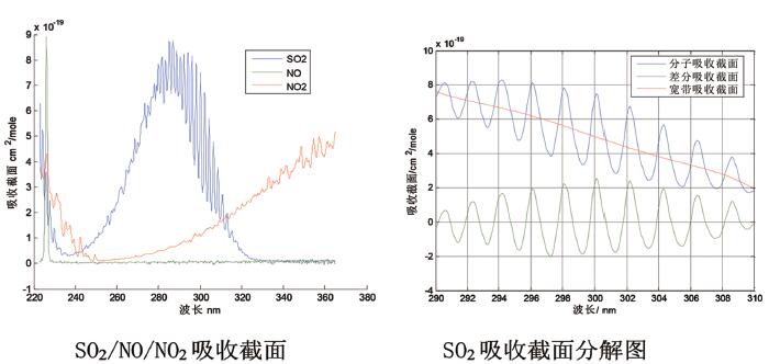 ASP-3000便攜式煙氣分析儀采用紫外-可見差分吸收光譜原理。該方法的特點在于將氣體分子吸收截面分成了兩部分:僅僅由待測氣體分子引起的隨波長快速變化的差分吸收截面(窄帶吸收截面)和由待測氣體、干擾氣體和粉塵顆粒等引起的隨波長緩慢變化的寬帶吸收截面。通過信號處理可提取要測量氣體組分的濃度信號,利用特定算法即可求得被測氣體濃度。