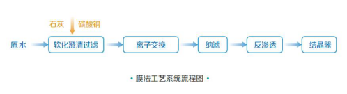 膜法工藝采用化學(xué)軟化和樹脂軟化后,將廢水通過納濾膜截留硫酸鈉,氯化鈉采用反滲透進(jìn)一步濃縮,濃縮液進(jìn)入結(jié)晶器制備高品質(zhì)氯化鈉。納濾濃水回預(yù)處理系統(tǒng)。