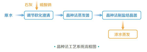 晶種法工藝采用調(diào)節(jié)軟化,即系統(tǒng)并不投加碳酸鈉去除鈣離子,后面也不需要過濾和離子交換,而是采用投加石灰和硫酸鈉兩種廉價藥劑,將廢水調(diào)整為氯化鈉和硫酸鈣兩種無機(jī)鹽溶液成分,澄清后直接進(jìn)入晶種法蒸發(fā)器,以防止硫酸鈣在蒸發(fā)器結(jié)垢。蒸發(fā)器濃水進(jìn)入晶種法制鹽結(jié)晶器,在結(jié)晶器內(nèi)將石膏晶種與氯化鈉分離,制備高純度氯化鈉,石膏晶種回預(yù)處理系統(tǒng)脫水。晶種法工藝運(yùn)行成本大幅降低,非常適合硬度較高、水量較大(10m3/h以上)的系統(tǒng)。