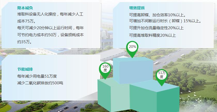 精準(zhǔn)流量控制取料:成功應(yīng)用機器視覺精準(zhǔn)識別垛邊、在線寸動調(diào)整 仿人技法3D打印堆料:支持人字行、梯形、魚鱗狀堆料工藝,規(guī)范化堆形及提高料場存儲效