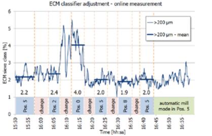 有了煤粉細(xì)度分析儀以后,就能實(shí)時(shí)優(yōu)化煤粉細(xì)度,從而改善燃燒并降低飛灰含碳量。采用磨煤機(jī)的分離器可以調(diào)節(jié)煤粉的細(xì)度。在調(diào)節(jié)和檢測(cè)煤粉細(xì)度時(shí),要用煤粉細(xì)度分析儀進(jìn)行連續(xù)測(cè)量,由此很容易獲得最優(yōu)的磨煤機(jī)設(shè)定值。右圖的測(cè)量結(jié)果說明煤粉細(xì)度儀具有高度的重復(fù)性和準(zhǔn)確度。